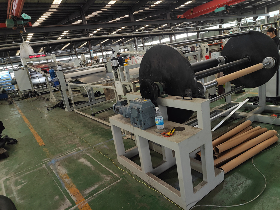 Ⅱ、擠出工藝:(三顆粒一粉三油六小料配料系統(tǒng)---高混機(jī)---緩存箱)另外報價------單螺桿計量式喂料——-JDL-75B雙螺桿擠出機(jī)---——液壓板式換網(wǎng)系統(tǒng)------片材擠出模具-----三輥壓光------三輥冷卻系統(tǒng)----下覆膜裝置----托架冷卻------切邊裝置----冷卻牽引-----10米緩存區(qū)-----自動糾偏系統(tǒng)---三輥輸送帶----計米器------飛切系統(tǒng)-----單臂收卷機(jī)(推出功能)四個開袋系統(tǒng)------輸送帶平臺------主機(jī)采用:PLC控制