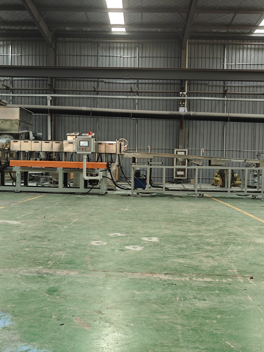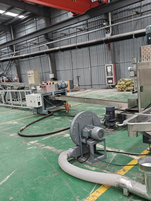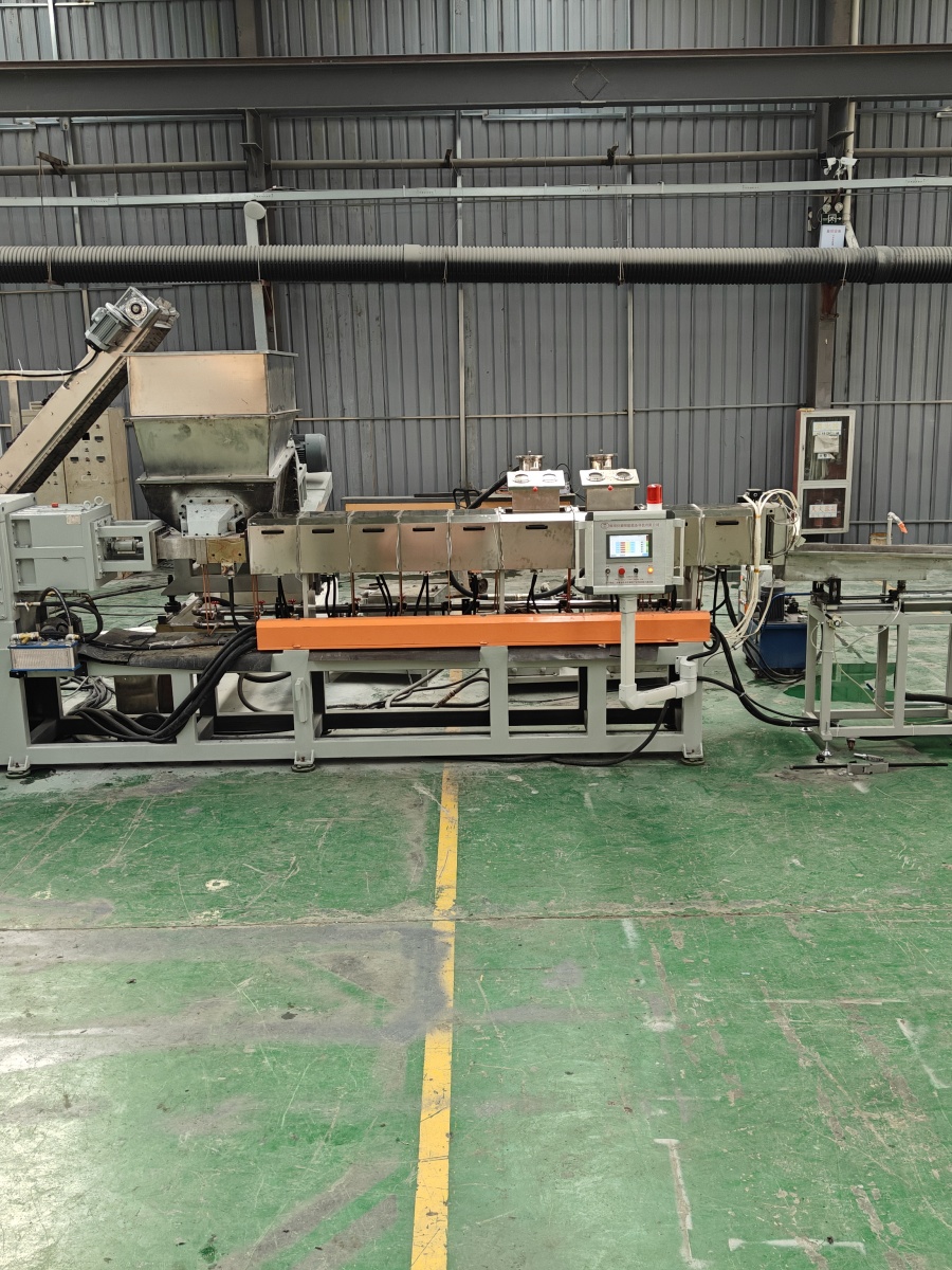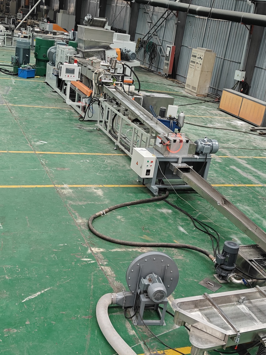 Ⅱ、造粒工藝:(2噸塔式烘干機(jī)2臺(tái)-----螺旋上料機(jī)----金屬分離器)客戶自備------單螺桿喂料機(jī)——-JDL75D雙螺桿擠出機(jī)---—液壓板式換網(wǎng)——拉條機(jī)頭----5米不銹鋼水槽-----水沖龍門(mén)切粒機(jī)-------離心脫水機(jī)-----2.5米不銹鋼振動(dòng)篩-------風(fēng)冷成品料倉(cāng)----噸袋自動(dòng)稱重系統(tǒng)------主機(jī)采用:PLC控制